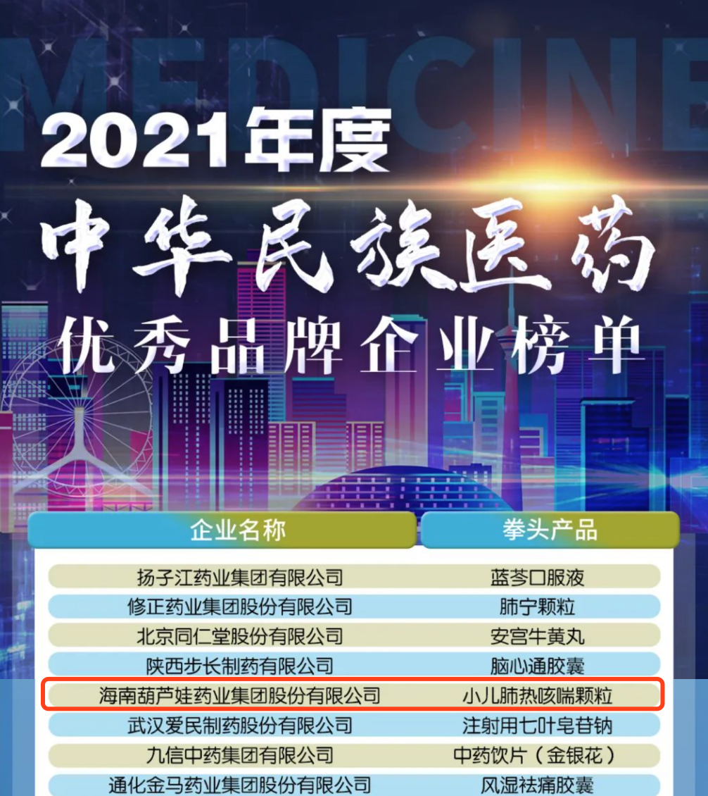 12月29日,全国工商联医药业商会发布了“2021年度中华民族医药优秀品牌企业榜单”,AG贵宾会药业集团凭借黄金单品小儿肺热咳喘颗粒(4克)实力登榜。